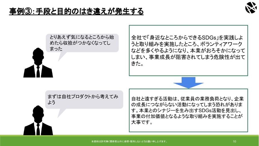 SDGsについて「まずは身近のことから」と従業員各々が取り組むこと自体は良いことですが、事業と関係のない取り組みを始めると、収拾がつかなくなる懸念が生まれます。