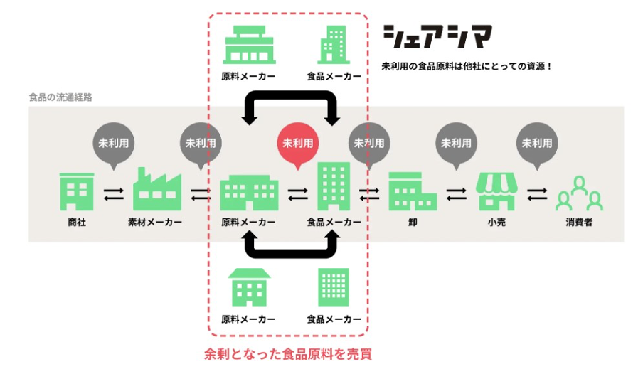 原料検索サービスのシェアシマは、余った食品原料を原料メーカー、食品メーカー間で売買するサービスを展開しています。