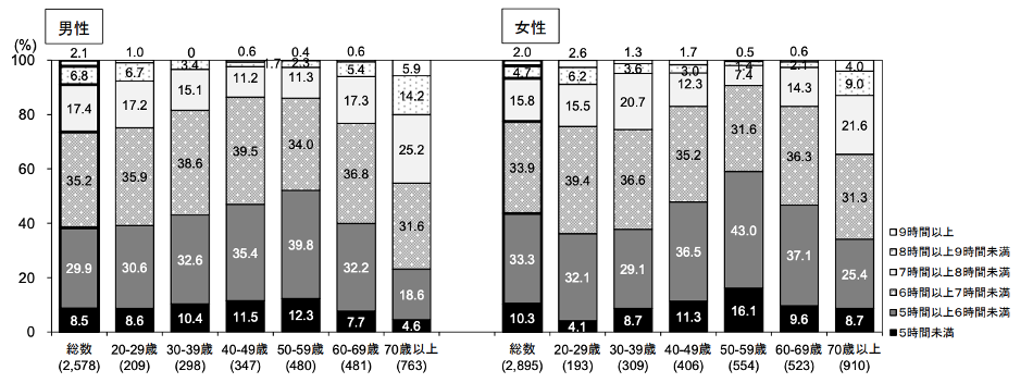 成人の場合、適正な睡眠時間は6時間以上とされますが、厚生労働省の2023(令和5)年「国民健康・栄養調査」を見ると、平均して5時間未満の人は約10%、5時間以上6時間未満の人は約30%。