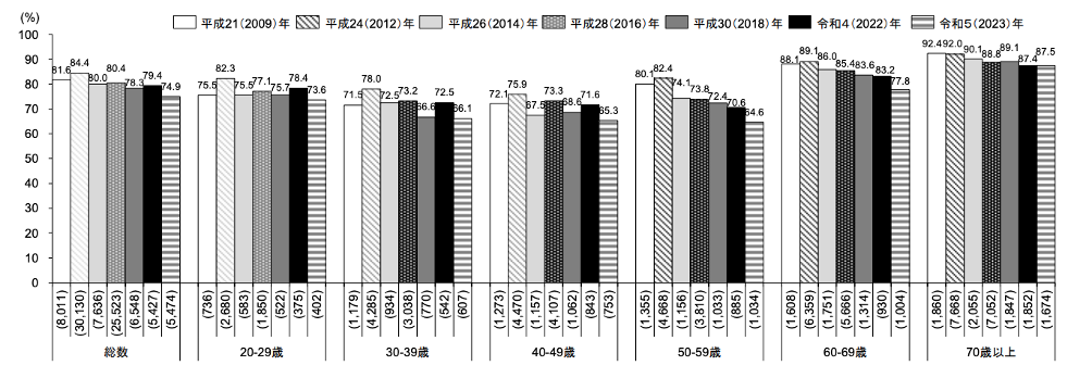 仕事や家事・育児に忙しい30〜50歳代では、「睡眠で休養がとれている」と考える人が65〜66%前後と、ほかより低い割合となっており、現役世代の睡眠負債が課題となっています。