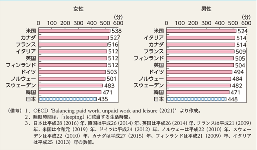 世界各国の睡眠時間を比べると、日本人は男女ともに睡眠時間が最も短くなっていることがわかります。