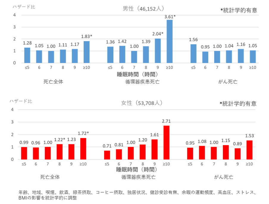 睡眠時間と死亡率の関係を調べた研究では、特に男性の場合、睡眠が7時間の人と比較して、5時間以下の人と10時間以上の人は死亡リスクが高くなりました。