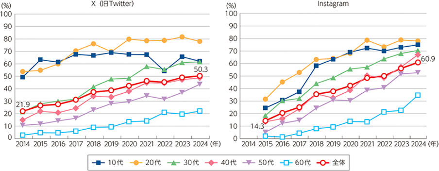 ひと昔前は若い人がユーザーのメインと思われていたInstagramですが、総務省による統計によれば10代〜20代だけでなく、30〜60代まで幅広い年代に使われているSNSであることが明らかになっています。