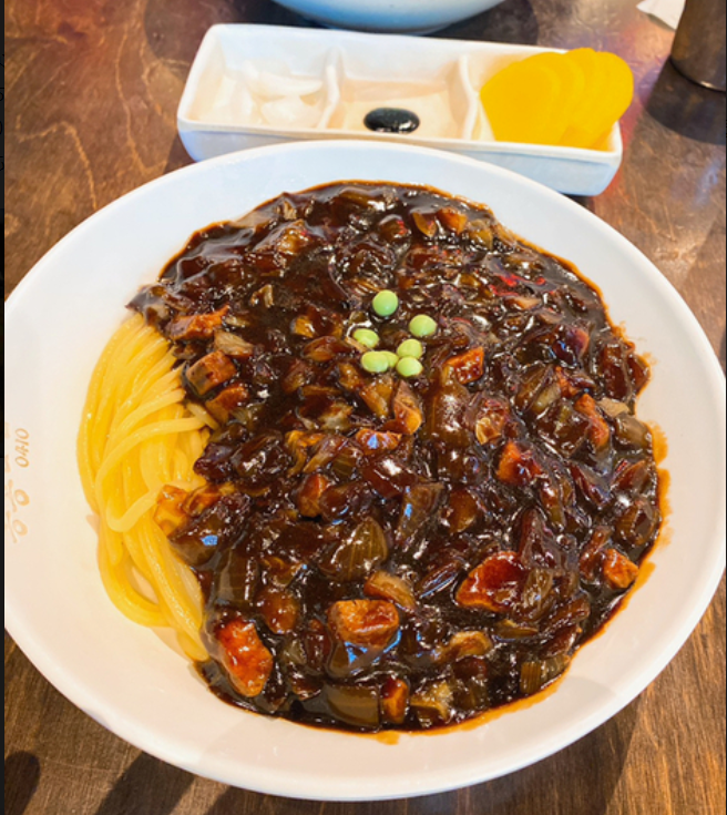 中でもチャジャン麺は中太麺に黒いソースがかかっており、ソースの具材は豚肉・玉ねぎなど。