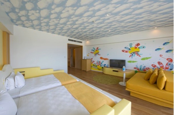 「ホテル オリオン モトブ リゾート&スパ」には、水族館をイメージした客室「オーシャンキッズ」があります。やんばるの絵描き・運天肇氏が絵を手がけ、「クマノミ」「ジンベエザメ」「ウミガメ」「イルカ」「チンアナゴ」の5つの部屋を用意しています。